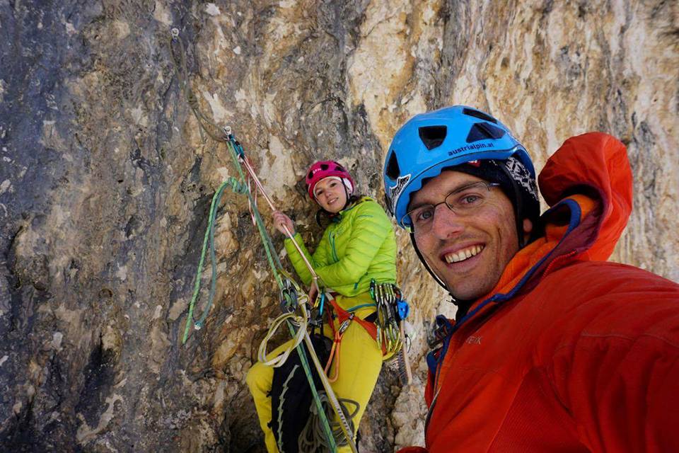 Also ging es ohne großen Schneekontakt bis unter die besagte Wand. Die bei diesem Ausflug entstandenen Fotos waren vielversprechend. Ich konnte eine Linie für mich entdecken und somit war unser Projekt geboren. Der Frühling wurde ähnlich mild. Nachdem ich Simon bei der Fertigstellung unserer Erstbegehung „Das Echo der Zeit“ am Bandiaracpfeiler begleiten durfte, wollte ich unbedingt zu besagter Wand. Sabrina war sofort dabei. An diesem Apriltag bewies Sabrina wirklich aus welchem Holz sie geschnitzt war. Wir schafften es an diesem Tag die ersten drei Seillängen von unten einzubohren. Stundenlang harrte sie bei kalten Temperaturen aus, um mich sehr geduldig zu sichern.