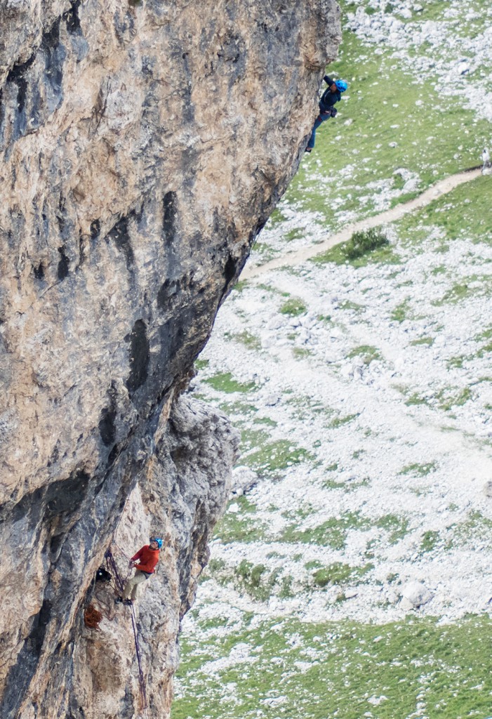 Die Felsqualität entspricht dem, was ich mir unter einer schönen Tour vorstelle. Insgesamt brauchte ich dann weitere vier Tage in der Tour, bis ich sie endlich rotpunkt klettern konnte. Mit dabei waren Julia Hasslacher, Andreas Goller und Martin Wibmer ging sogar zwei mal mit. Er war es dann auch, der mich beim Durchstieg begleitete. Dabei lag der Schlüssel nochmal darin, die Bewegungsabfolge in der Schlüsselsequenz umzustellen um eine halbwegs stabile Lösung zu finden. An diesem Tag war es dann auch nochmal denkbar knapp.